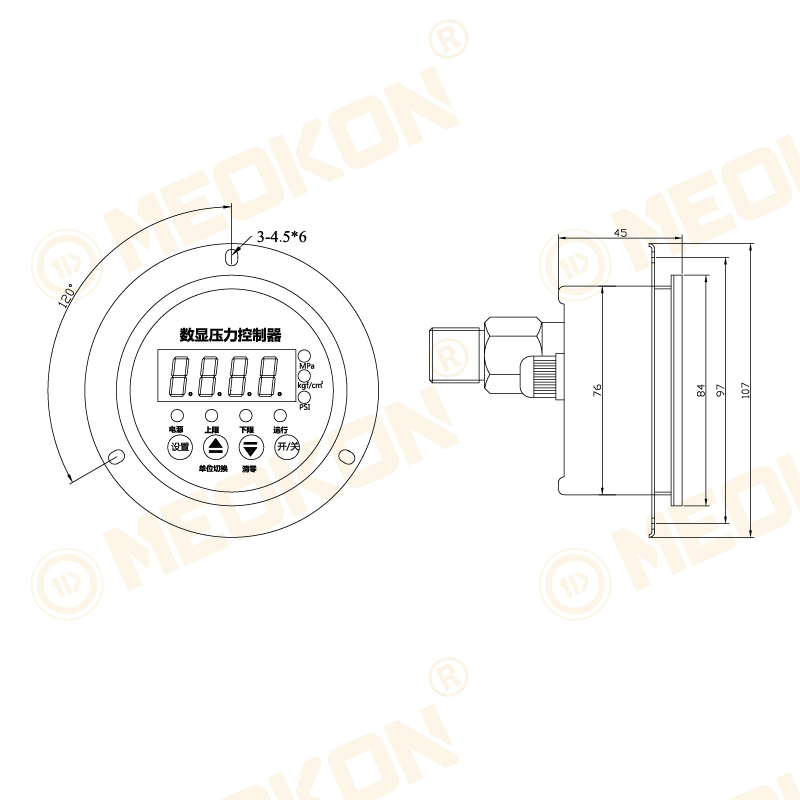 直徑75mm帶邊,0.5級,軸向安裝,LED數(shù)碼管顯示,304不銹鋼材外殼及接頭。 內(nèi)置繼電器,可控制低壓閉合高壓斷開或反向控制,多種輔助控制功能。